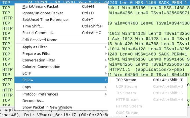 Using Wireshark, I right clicked on the first TCP packet, moved down to the follow option and then selected TCP Stream. This enables me to follow the TCP protocol stream and view a protocol in the way that the application layer sees it.