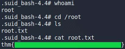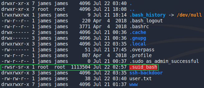 At first, I believed that the user james was able to run any command with root privileges using sudo based on the information found in the PCAP file earlier. However, I found that this was not true and I could not use sudo to run any commands as root. I decided to move back to james home directory and see if there were any interesting files. I immediately noticed that there was a hidden binary file owned by root in the directory called .suid_bash.