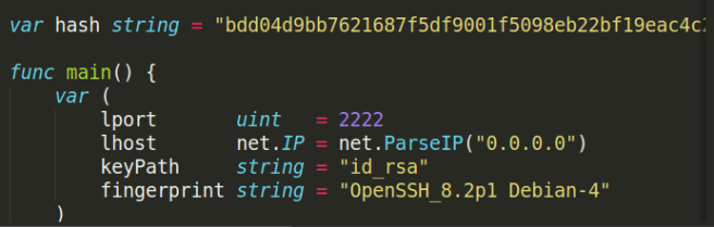 Looking through the contents of the repository downloaded from Github, I can see a file called main.go. I decided to examine this file using Sublime and while looking through the first few lines of code, I could see the default hash string for the backdoor.