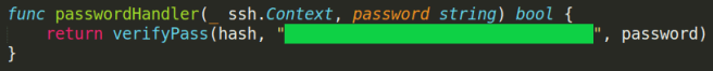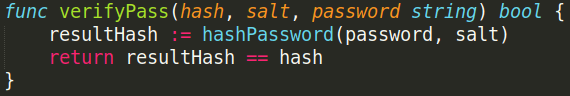 Moving down through the code in the main.go file, I found a function called verifypass which takes three parameters, one of which is called salt.