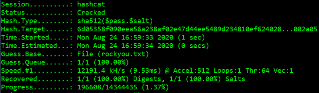 After recovering the hash, I can use the tool hashcat and the wordlist rockyou to crack the hash recovered above. Using the tool hash-identifier, I can confirm that the hash recovered used the SHA-512 algorithm. From examining the code for the backdoor earlier, I know that the SHA-512 hash is created using the password and then the salt in that order (i.e. password:salt).