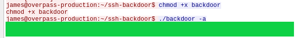 Going back to the PCAP file analysed earlier, it is possible to see that after the attacker has cloned the Github repository and has generated an RSA key pair, the attacker then proceeds to make the backdoor file executable and executes the binary with a hash specified using the -a parameter.