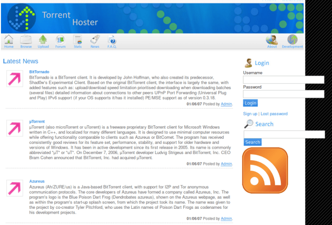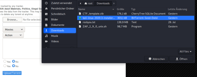 Let’s take a closer look at the upload functionality of the website. We’ll have to create a user first. Username and password can be something random like test:test. First I tried to upload a picture, but I got an error message saying “This is not a valid torrent file”. So I guess I’ll have to upload a .iso.torrent file: