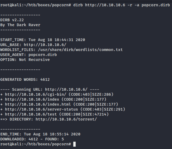 dirb http://10.10.10.6 -r -a popcorn.dirb