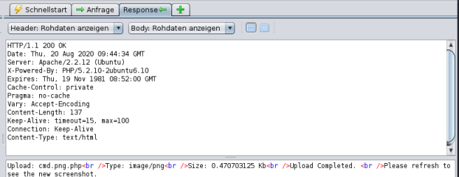 This is how the manipulated request looks like. I changed the filename from cmd.php to cmd.png.php just incase the server checks if “png” is in the filename. The Content-Type in the PHP upload request was application/x-php. I changed it to image/png and the content of the file. I just copied a few lines of bytes from the .png file and put them in the manipulated request body. Now the server thinks it’s a .png file. This actually worked: