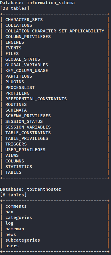 Sqlmap is not allowed in the OSCP exam, but I still wanted to try it out. To my surprise, it did actually work and I got two databases with different tables as a result:
