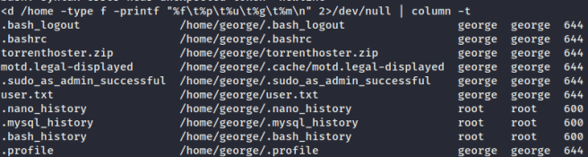 find /home -type f printf “%f\t%p\t%u\t%g\t%m\n” 2>/dev/null | column -t