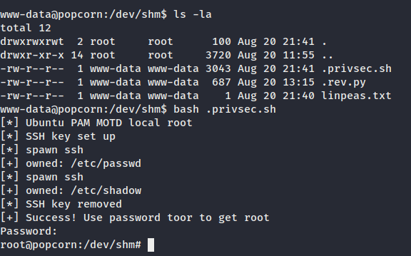 As we can see here, the command “ls -la” shows us our file which I named “.privsec.sh”. If we type in “bash .privsec.sh”, the script will run and all we have to do is type in the user password, which is “toor”.