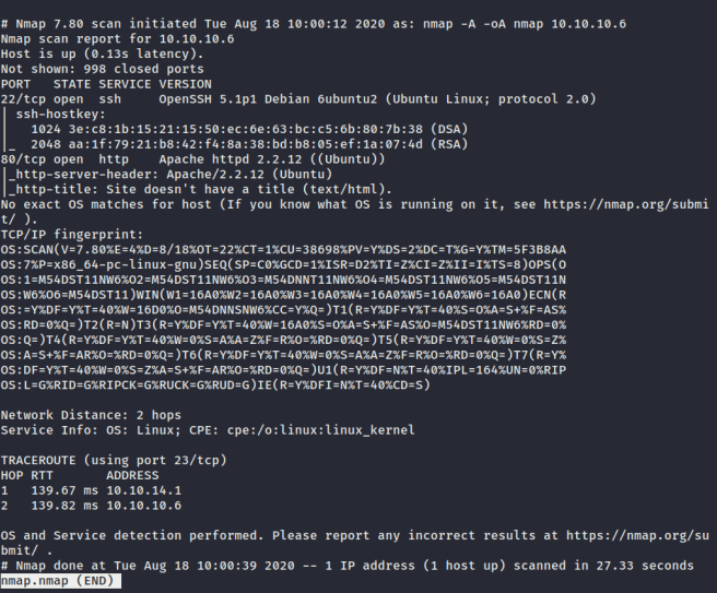 This scan setup runs very fast and shows important results. The -A enables OS detection, version detection, script scanning, and traceroute. The -oA nmap saves our scan in a file. On a regular pentest, I would run a different nmap setup. Parameters like -p- for scanning all ports or -sU for a UDP scan are very important if you want to get the most information from a server. It just depends on how much time you have. I highly reccomand this nmap cheat sheet.