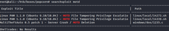 Motd.legal-displyed could be interesting. “Motd” stands for message of the day. We can use searchsploit to find exploits: