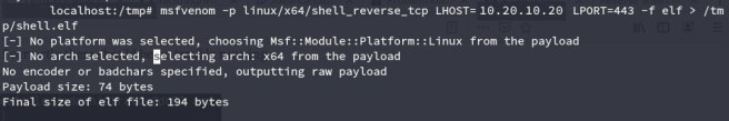 To do this, we started assembling a payload with msfvenom. In this case, the payload was a reverse TCP shell, for an x64 Linux machine (you can see that we had to select the DB architecture on the previous image).