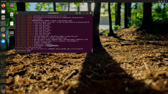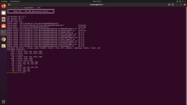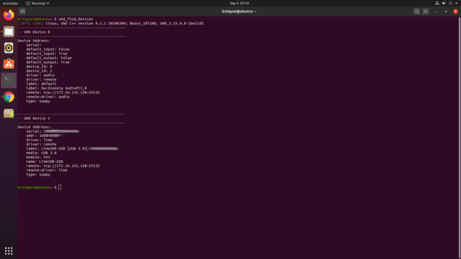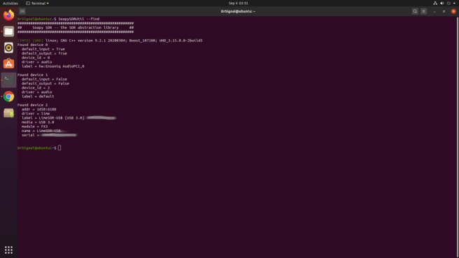 To demonstrate this, I ran the same command from another Ubuntu-20.04 machine. You can see the result as UHD not found. This is because there are no Soapy drivers installed. But you can see LimeSDR is connected($ dmesg).