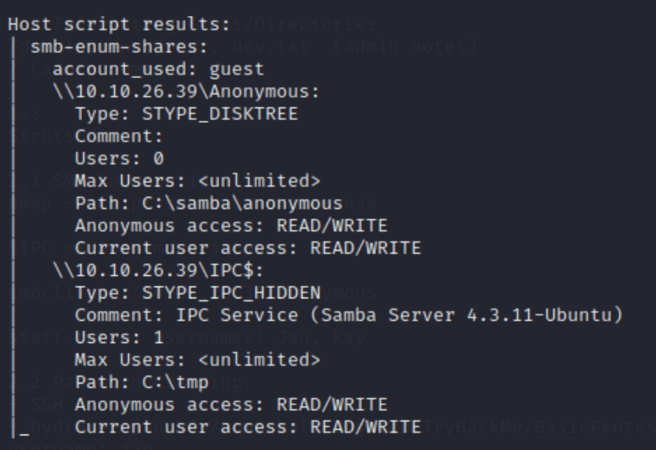 As we can clearly see, there are Anonymous and $IPC hidden shares. The $IPC share enables inter process communication as well as anonymous user login which requires no username or password. We can leverage this to our advantage by using the smbclient command and getting access to the anonymous share.