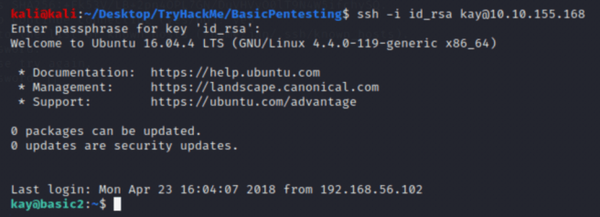 As can be clearly seen, the id_rsa file has been transferred to the local machine and from this point we can use this key to access kay’s user account.