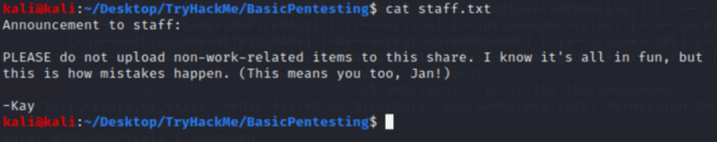 As we guessed earlier, here are the dev notes. Apparently, the webserver users’ usernames start with “j” and “k”. We can definitely use this information in the future. In addition, Mr. K said that the “SMB has been configured.” which was proved by the Nmap scan. The direction of further pentest will go that way.