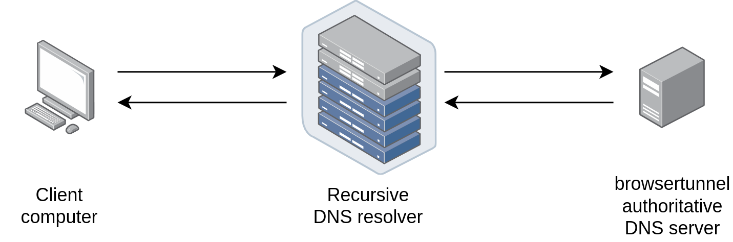 Browsertunnel can send arbitrary strings over DNS by encoding the string in a subdomain, which is forwarded to the browsertunnel server when the browser attempts to recursively resolve the domain.