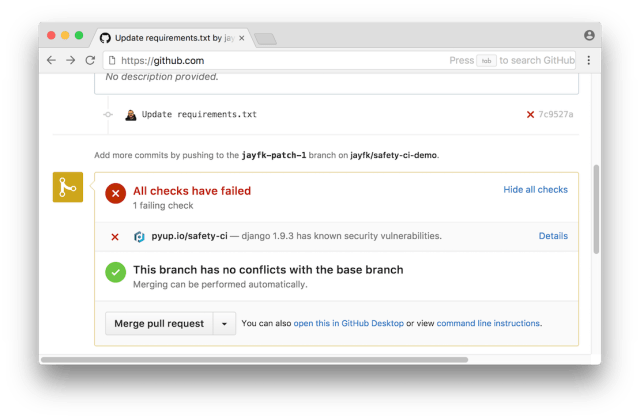If you are looking for a deep integration with your GitHub repositories: Safety is available as a part of pyup.io, called Safety CI. Safety CI checks your commits and pull requests for dependencies with known security vulnerabilities and displays a status on GitHub.