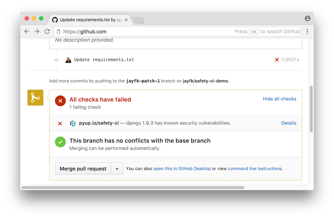 If you are looking for a deep integration with your GitHub repositories: Safety is available as a part of pyup.io, called Safety CI. Safety CI checks your commits and pull requests for dependencies with known security vulnerabilities and displays a status on GitHub.