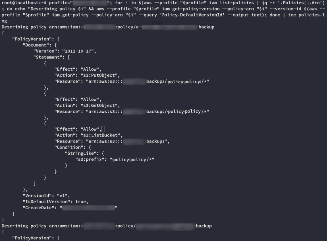 profile="test"; for i in $(aws --profile "$profile" iam list-policies | jq -r '.Policies[].Arn'); do echo "Describing policy $i" && aws --profile "$profile" iam get-policy-version --policy-arn "$i" --version-id $(aws --profile "$profile" iam get-policy --policy-arn "$i" --query 'Policy.DefaultVersionId' --output text); done | tee /tmp/policies.log