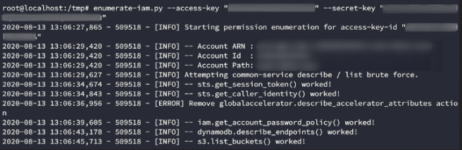 Assuming you can get an AccesKey, a SecretAccessKey and an ExpirationToken, you’ll want to enumerate your available permissions and find a way to maintain access because this credentials have an expiration date (as you can see in the picture) and there’s a chance that they won’t be renewed. By default this time is one hour, so you better hurry! The best tool I’ve found to do this is enumerate-iam.py (https://github.com/andresriancho/enumerate-iam), developed by Andres Riancho. You can use it like this (session token is optional)