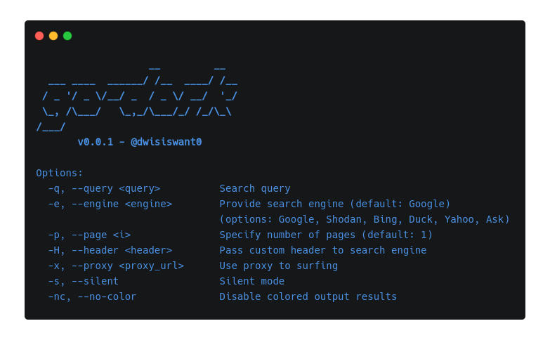 > GO111MODULE=on go get -v github.com/dwisiswant0/go-dork/...