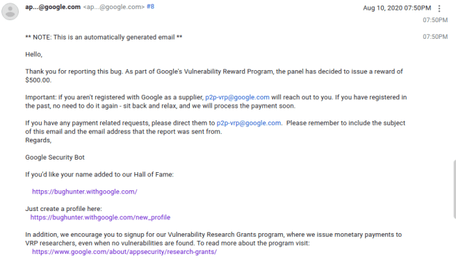 So, this was my first bounty from Google. I have reported other minor issues and got Hall Of Fame.