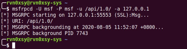 $ msfrpcd -U msf -P msf -u /api/1.0/ -a 127.0.0.1