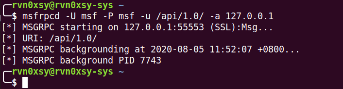 $ msfrpcd -U msf -P msf -u /api/1.0/ -a 127.0.0.1
