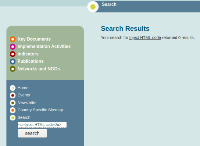 We can see that after clicking “search” button, our payload got reflected into HTML code. Now let’s see if we can inject Javascript code. This time, I will enter a Javascript payload.