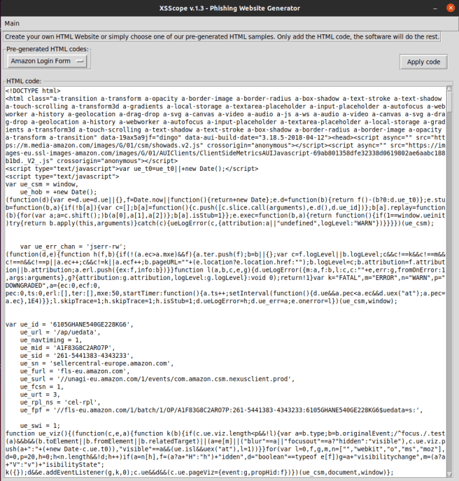 Now click on “Choose Pre-generated HTML code” and click on which website you like to generate a Phishing Clone. In this case, I will choose “Amazon Login Form”. The whole code will be added into the text box automatically, so click Apply Code.