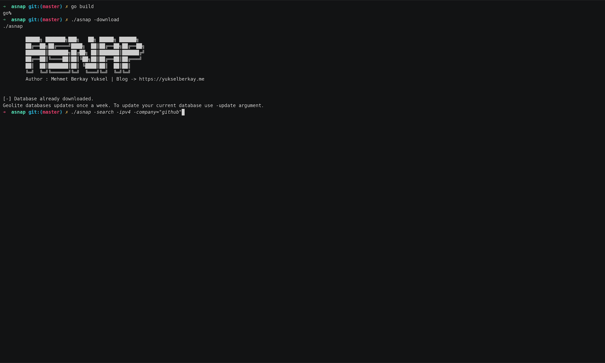 "$asnap -search -ipv6 -asn 13337" -> Search ipv6 database by as number "13337"