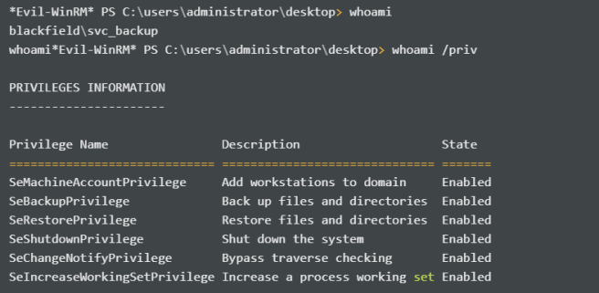 Then I remember that the svc_backupuser is a member of the Backup Operators group which most likely has the SEBackupPrivilege enabled. I verify it using whoami /priv :