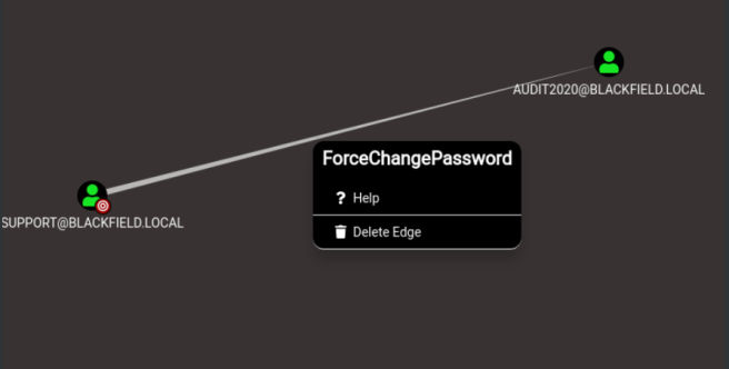 Loading the data on the Bloodhound GUI, it seems that the support user can force the password change of the user audit2020. This control of a user over another user is very common since helpdesk or support roles have the ability to reset a user’s password(since users often forget their passwords).