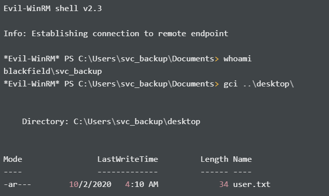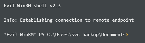 Since svc_backup is part of Remote Management Users, I try the hash gathered to use PowerShell Remoting thru Evil-WinRM: