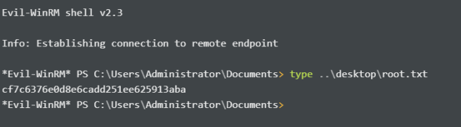 I can now utilize PowerShell Remoting to login as the Administratoruser, and read root.txt: