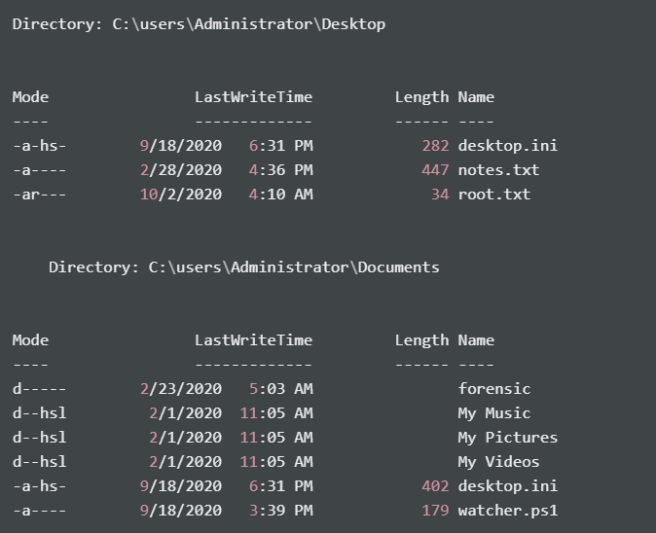 Also, it seems that the C:\Users\Administrator\Documents\forensic is mounted as the forensic share from SMB. Also, there is a watcher.ps1 file. I do not have the privileges to read it though, but I’ll check on it later after.
