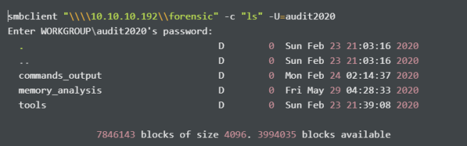 smbclient "\\\\10.10.10.192\\forensic" -c "prompt;recurse;mget *" -U=audit2020